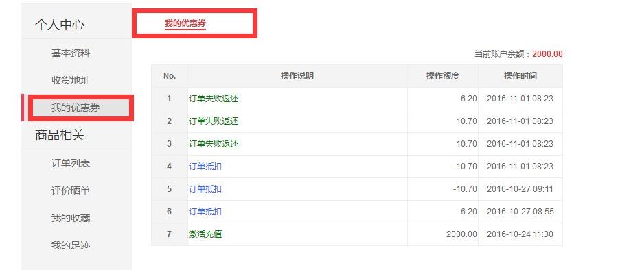 登陆 我的帐号—点击进入会员中心—优惠券,点击优惠券,示例见下图: