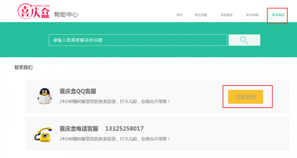 3进入帮助中心点击喜庆盒客服QQ联系在线客服