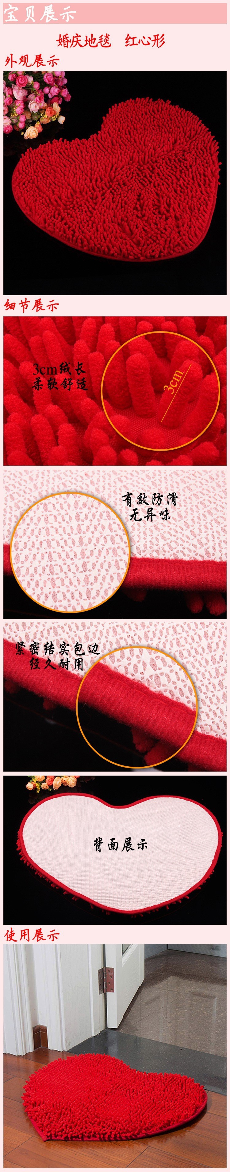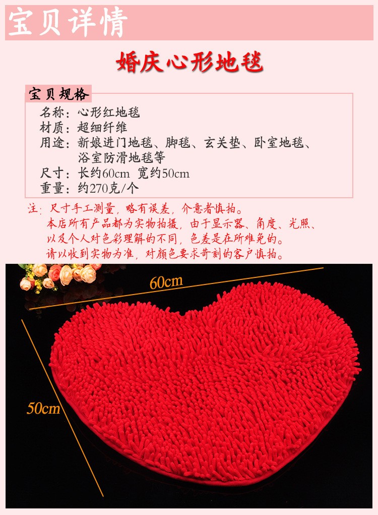 婚庆结婚用品 门垫/脚垫 婚房装饰 卧室红色心形地垫地毯 长毛款