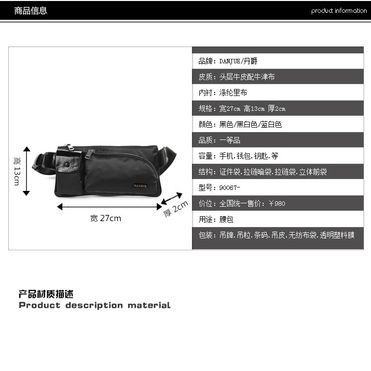 丹爵(DANJUE)牛津布配牛皮休闲男士腰包单肩斜挎包男包新款推荐90067