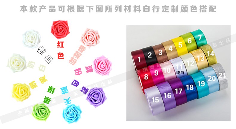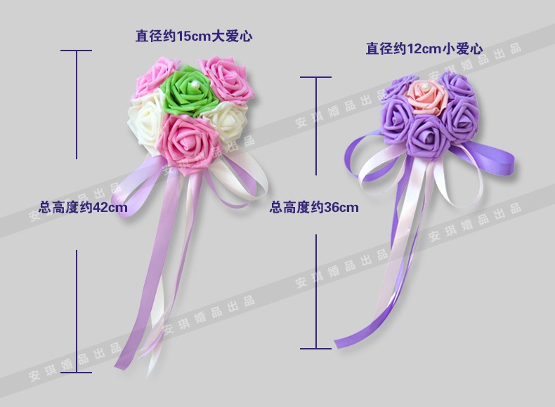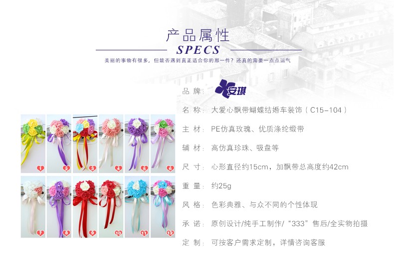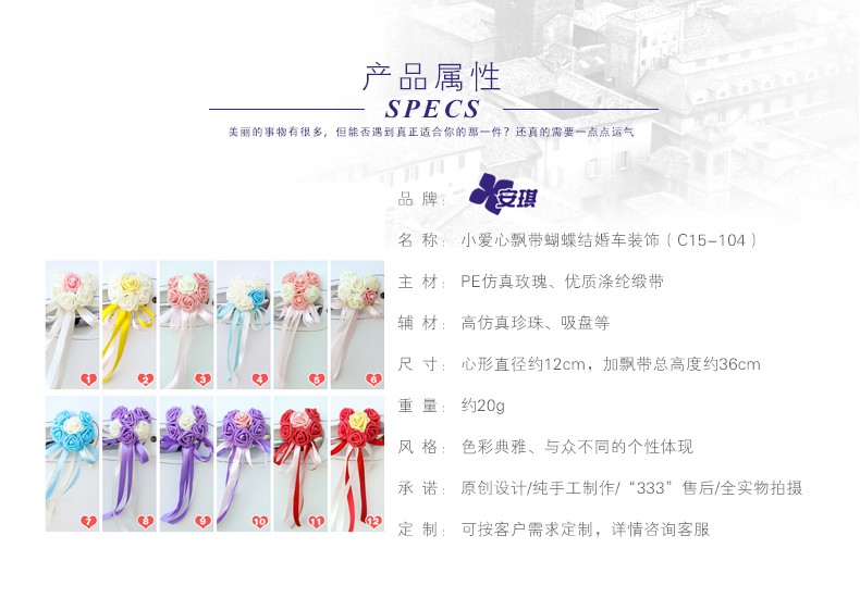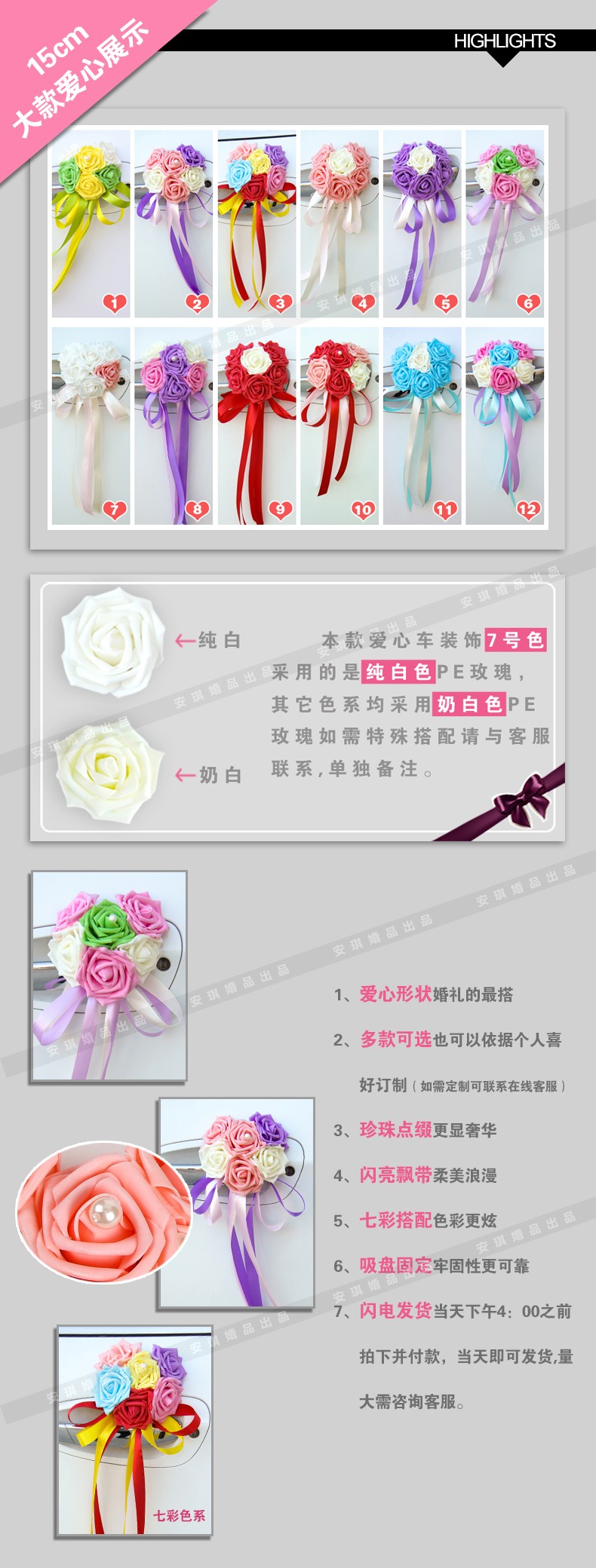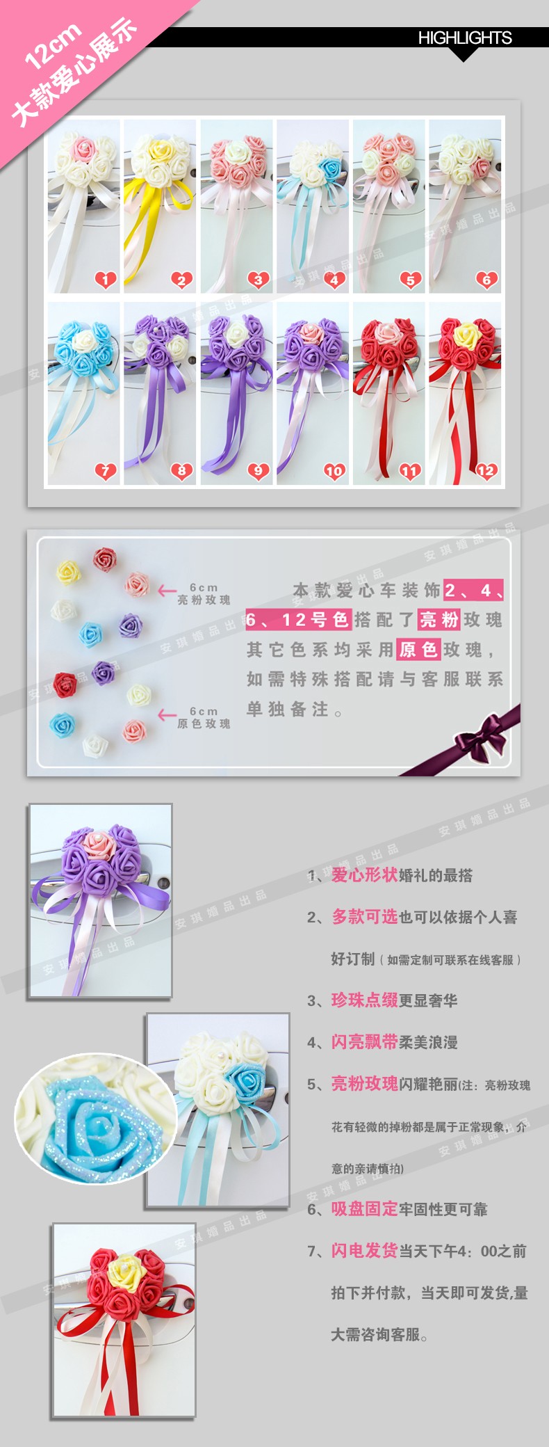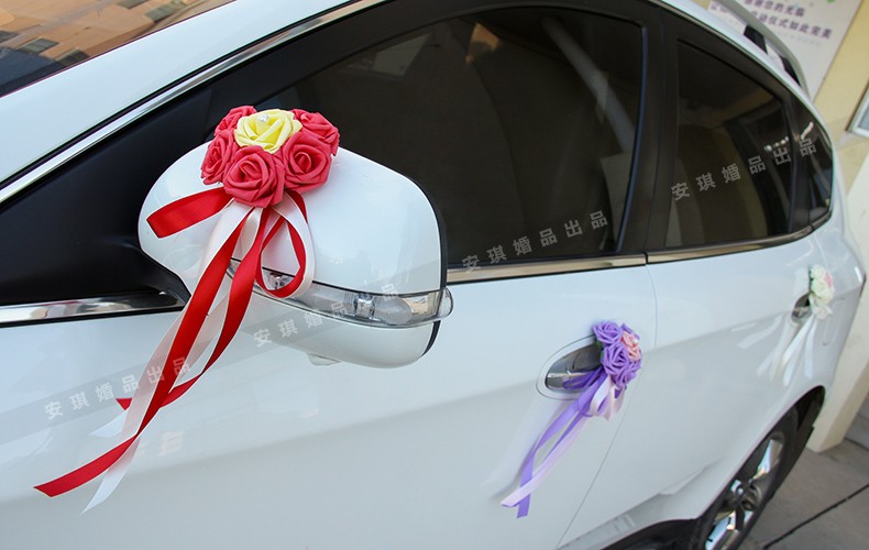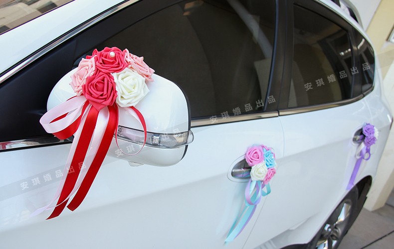 韩式车花婚礼心形点缀PE玫瑰飘带婚车门把手后视镜装饰婚庆装车