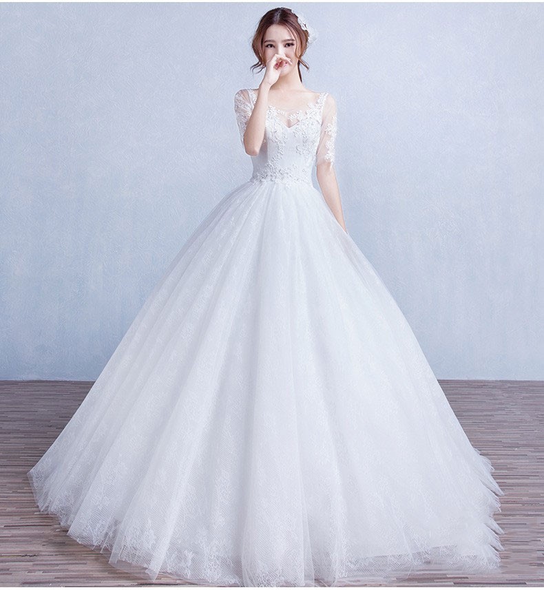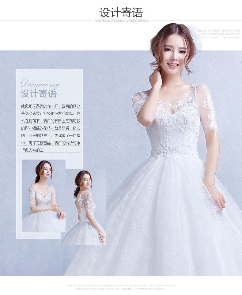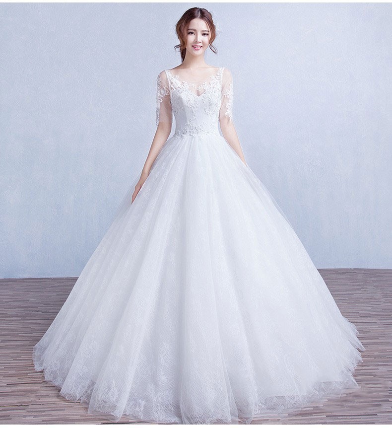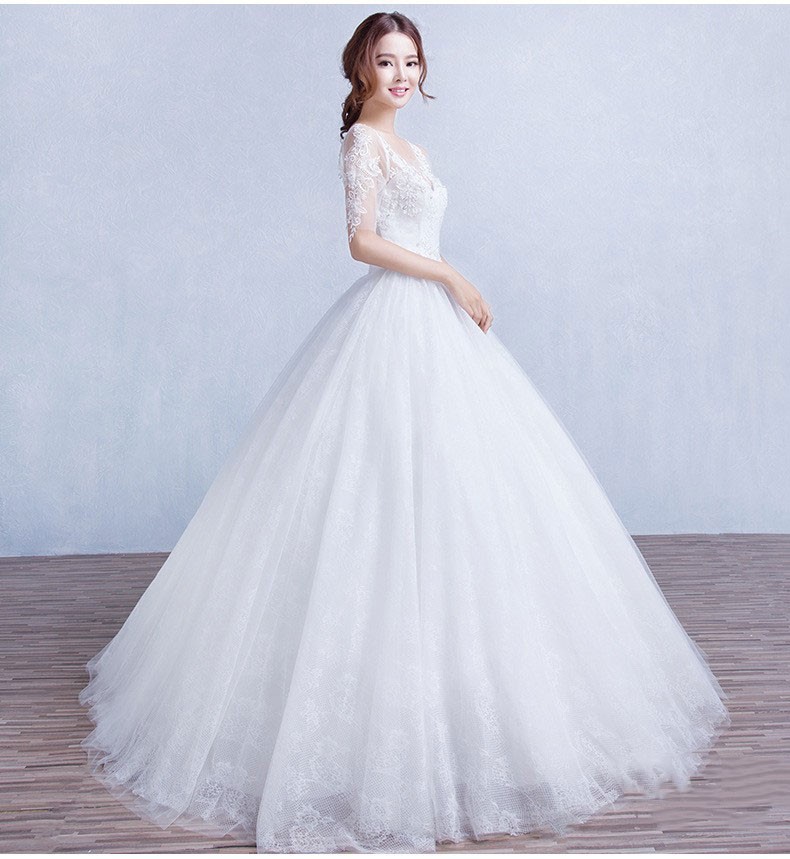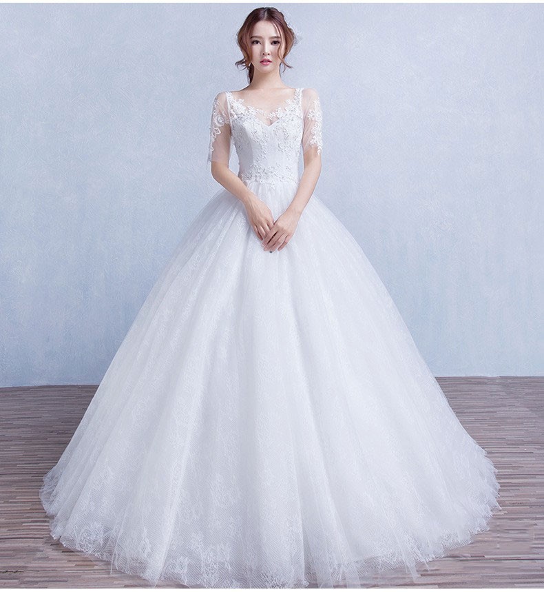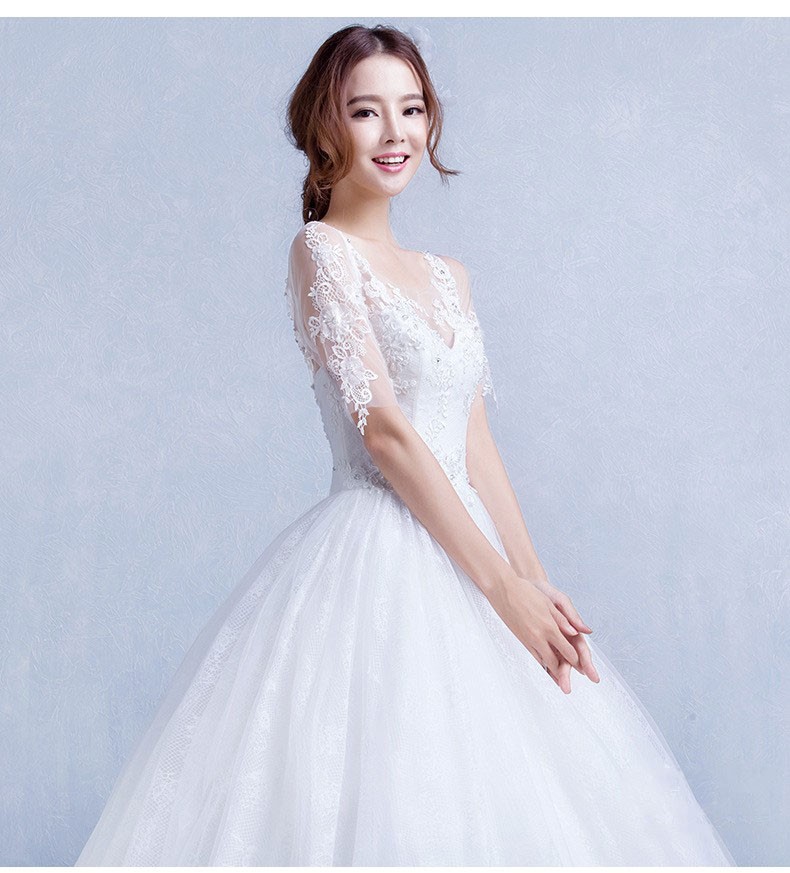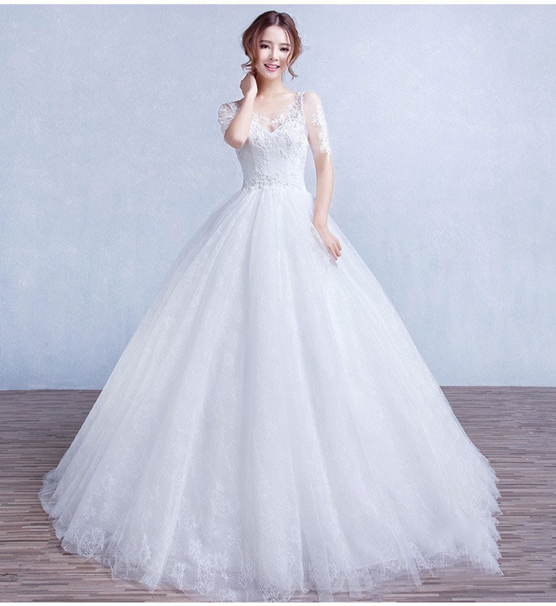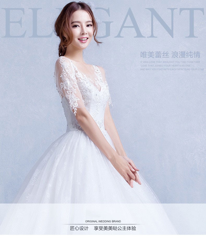 双肩中袖蕾丝v领显瘦婚纱