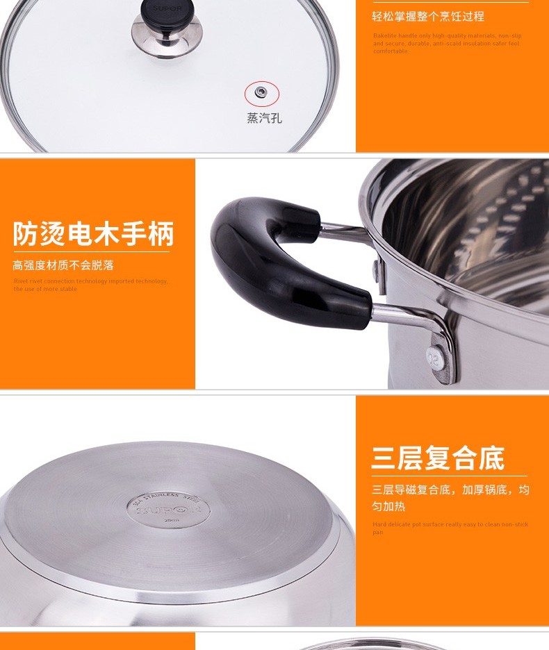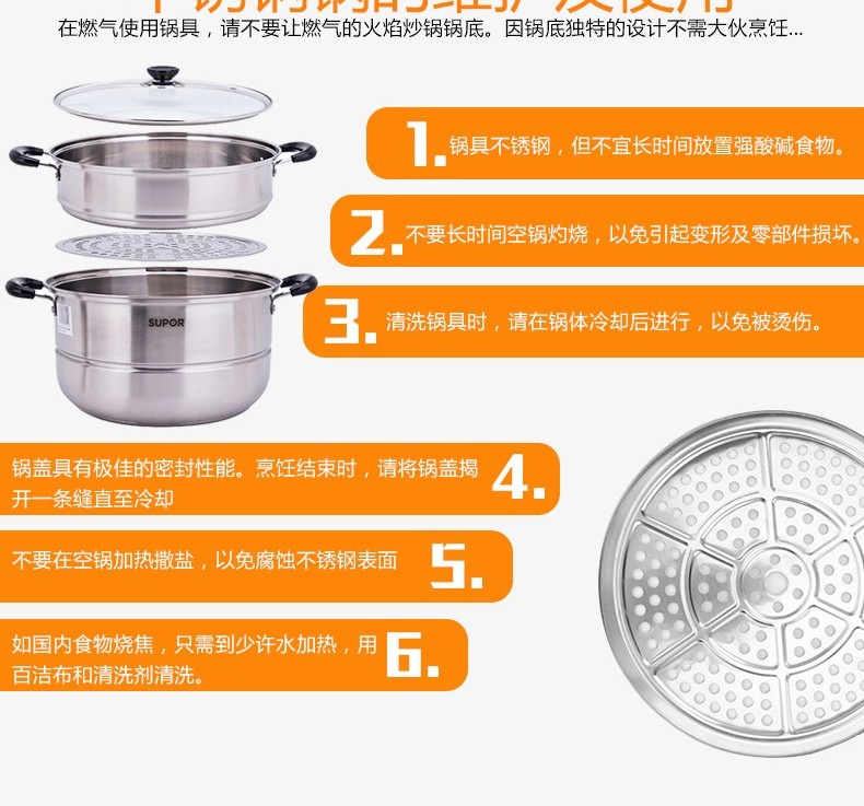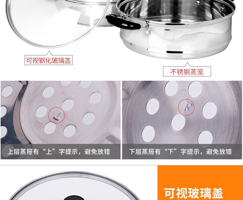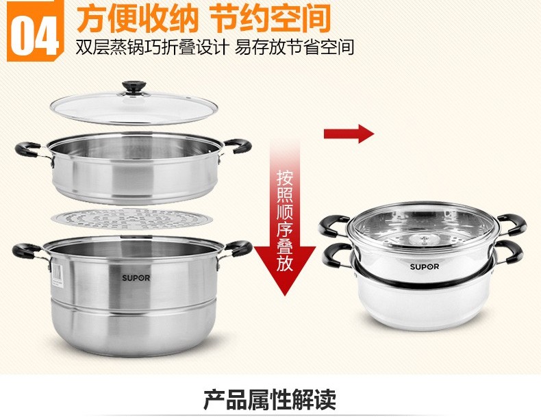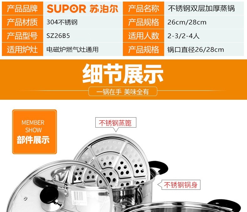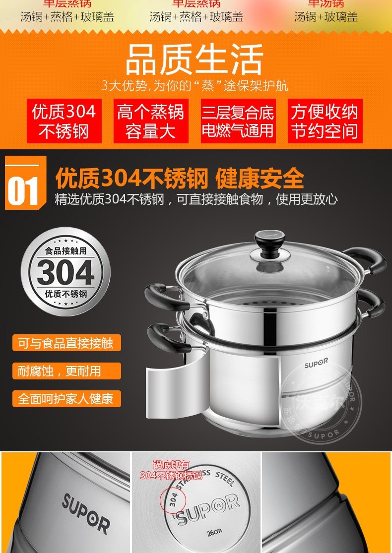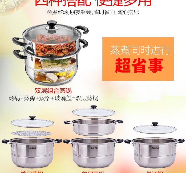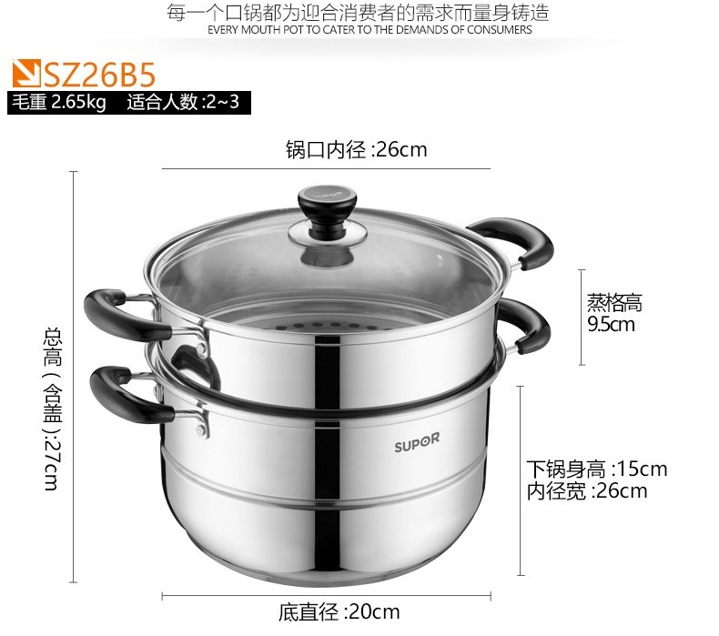 苏泊尔蒸锅304不锈钢二层2层双层加厚复底电磁炉锅具蒸格汤锅蒸笼SZ26B5