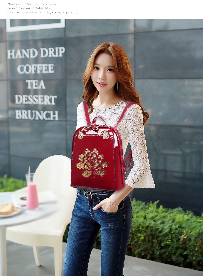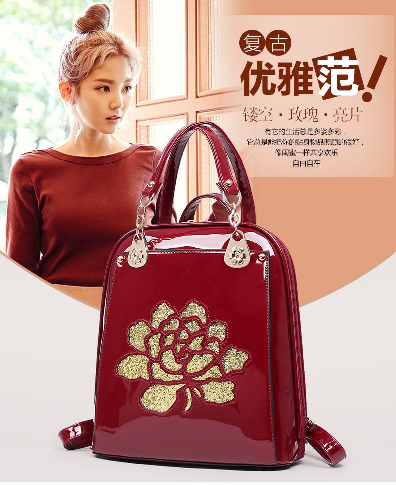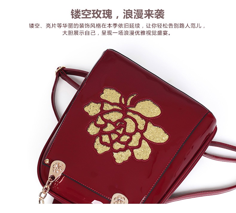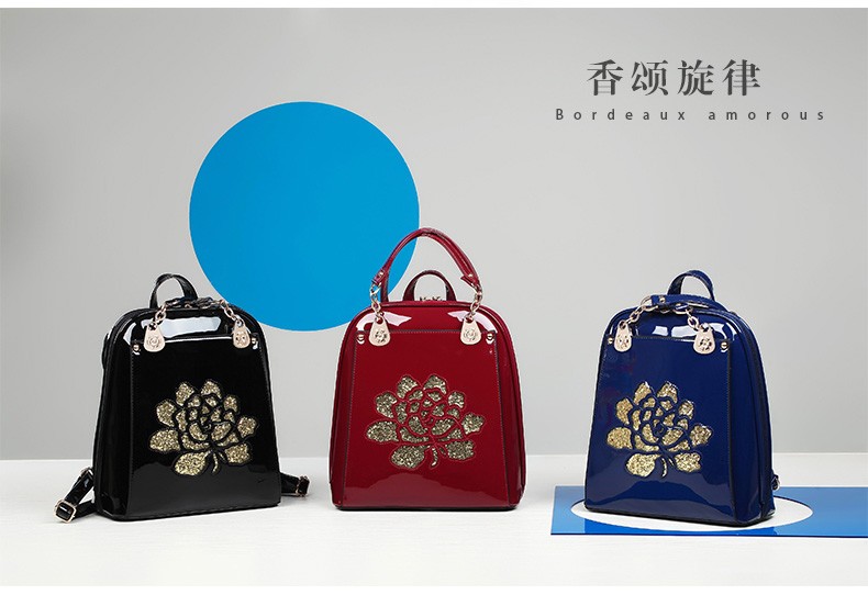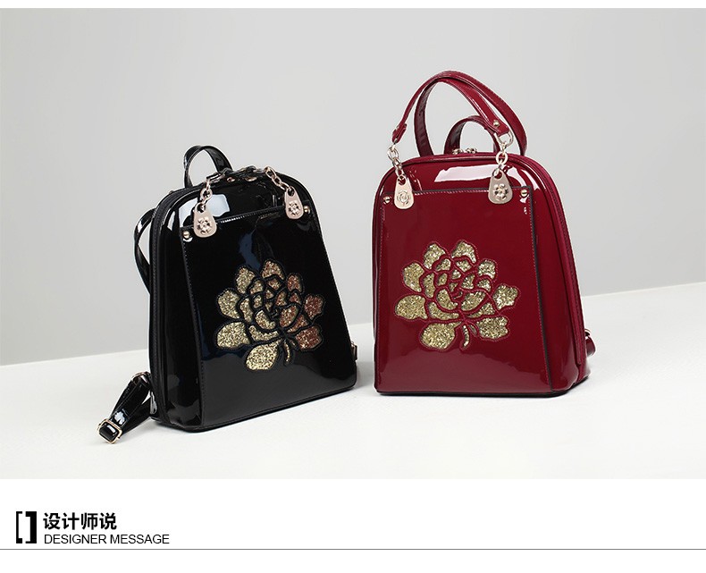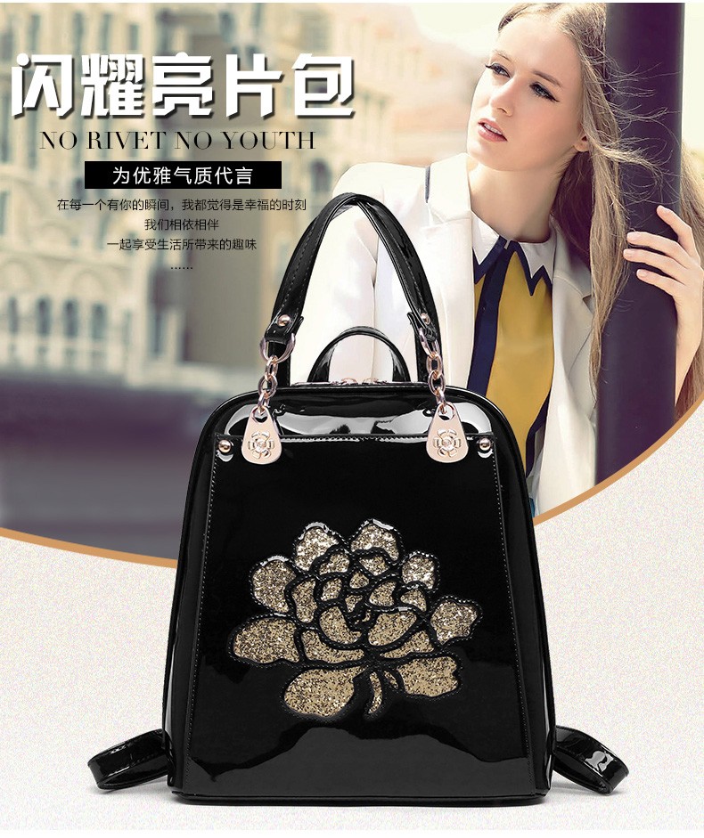 2017年新款女士书包中国风气质亮片漆皮手提包包多功能双肩背包