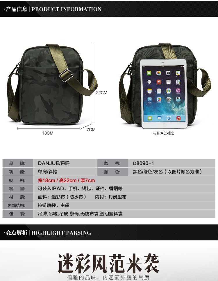 丹爵(DANJUE)男包新款潮酷迷彩单肩斜挎包 D8090-1