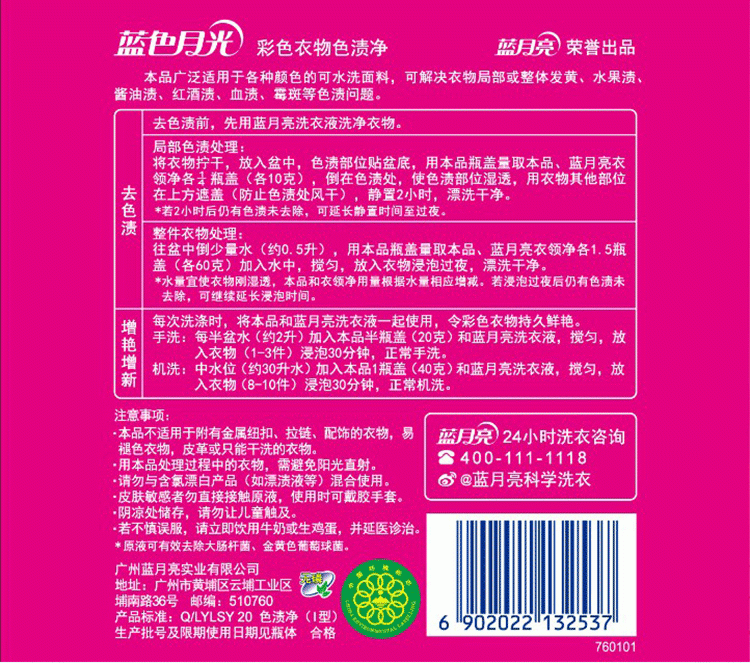 蓝月亮蓝色月光彩色衣物色渍净600g瓶彩漂渍液鲜艳除菌改善物发黄