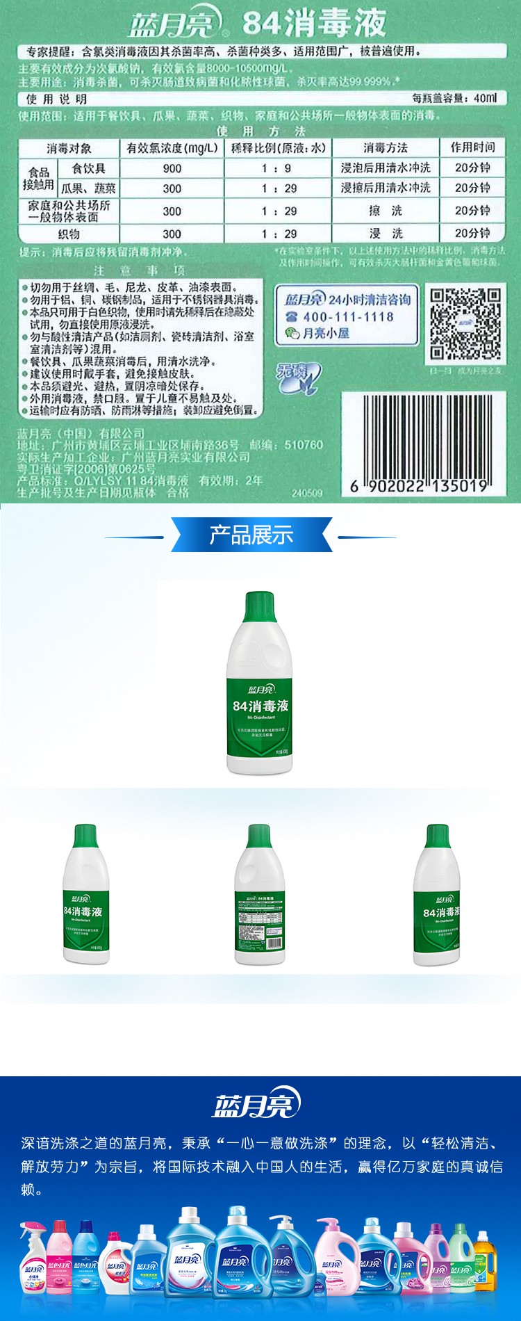 蓝月亮卫诺84消毒液600g瓶装家居衣物内衣除菌消毒水