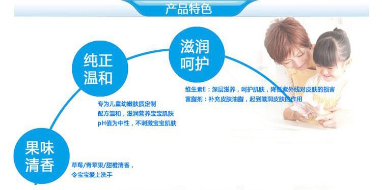 呵护儿童细嫩双手、清新果香、容易冲水