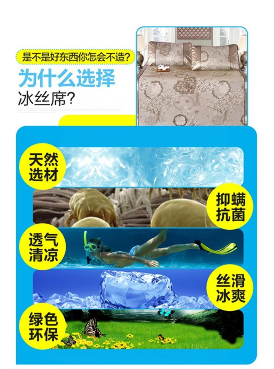 冰丝席印花三件套 双人凉席 五彩缤纷