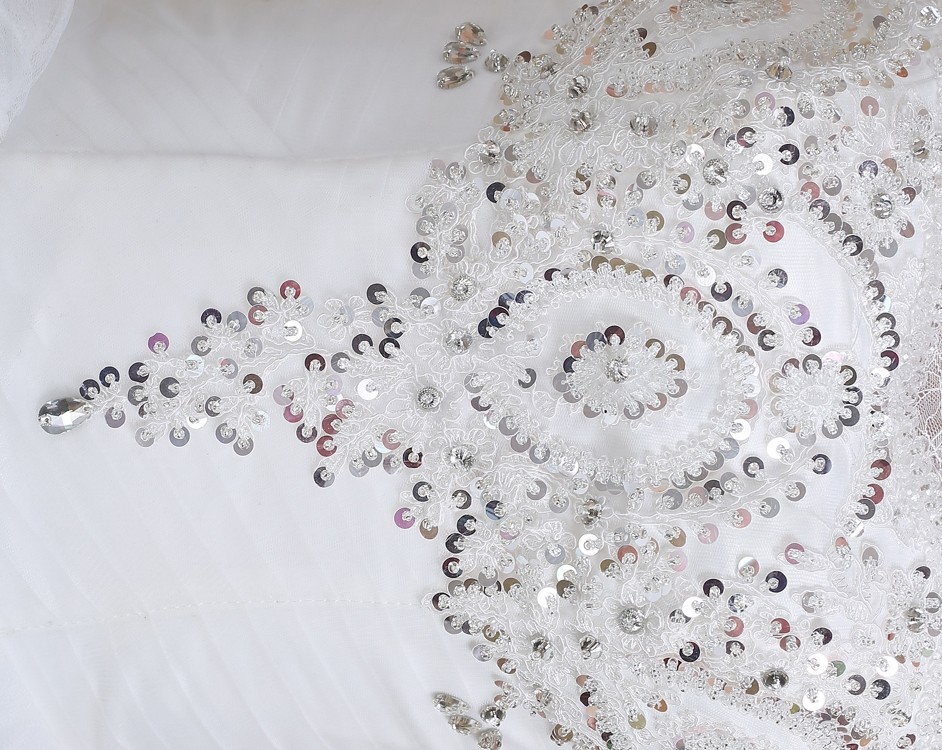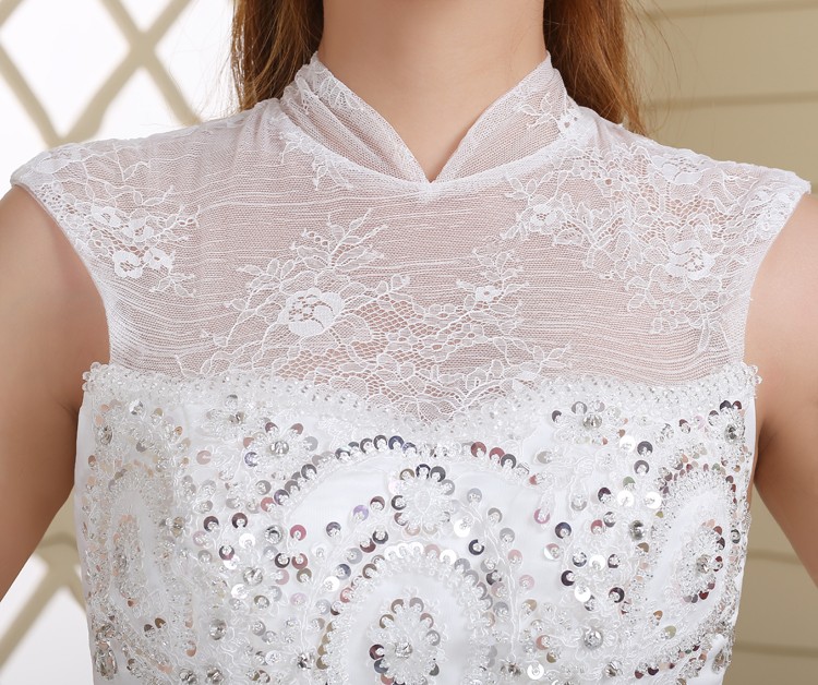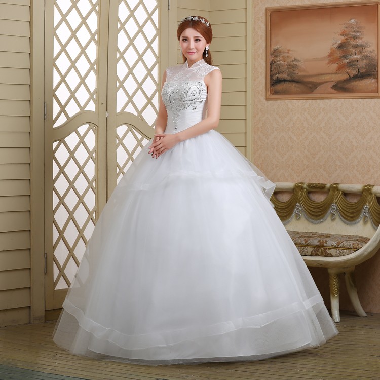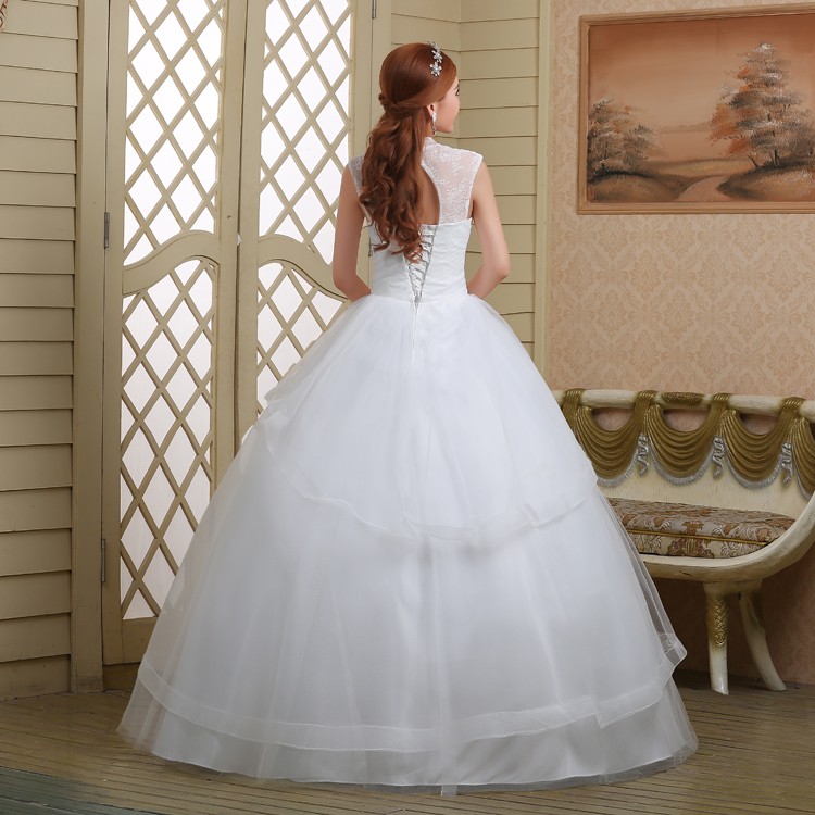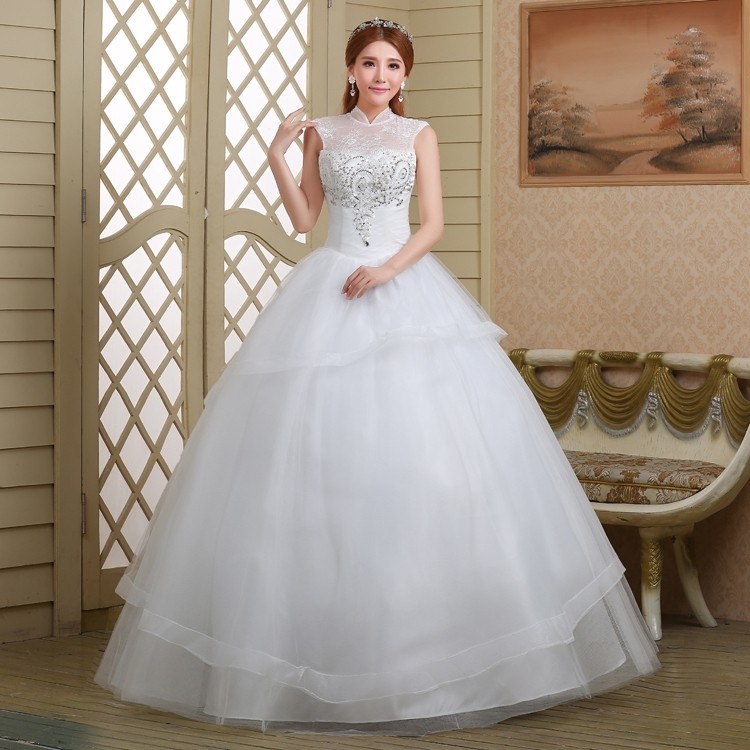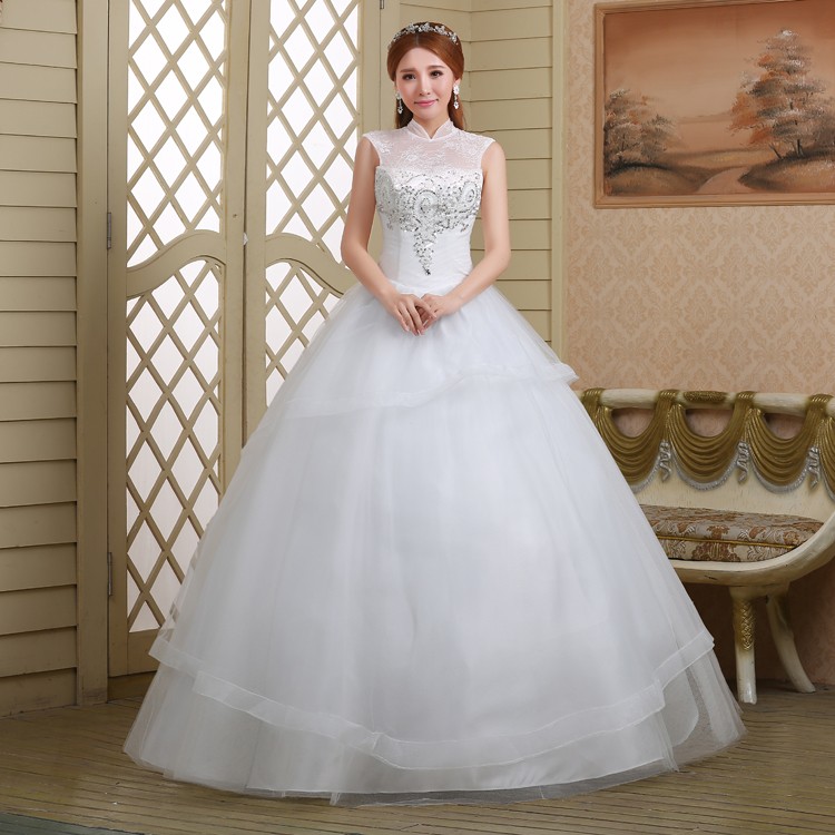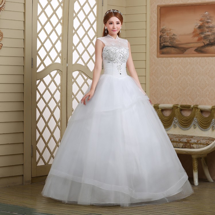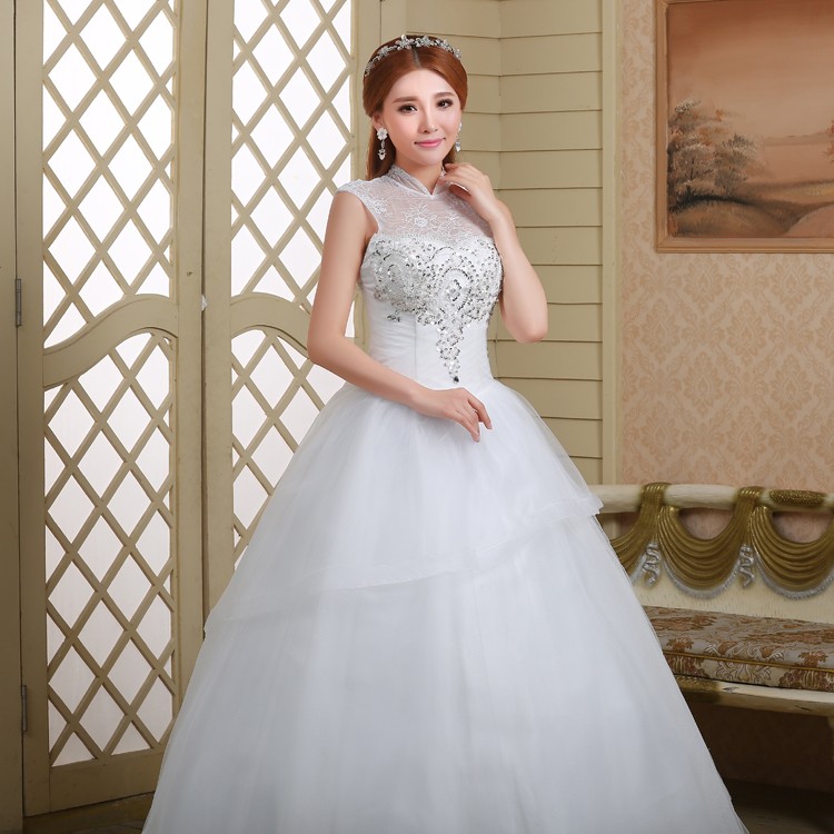 新款2017高档 新娘一字肩齐地简约蕾丝镶钻包肩立领影楼婚纱832-1
