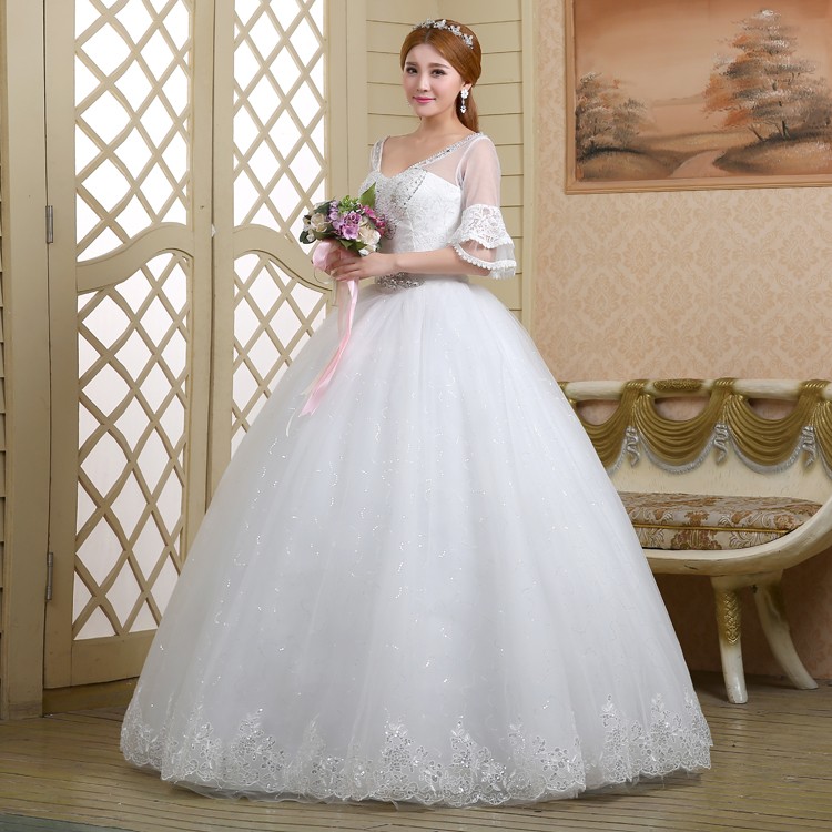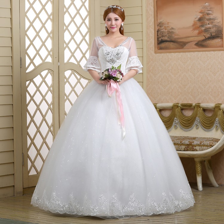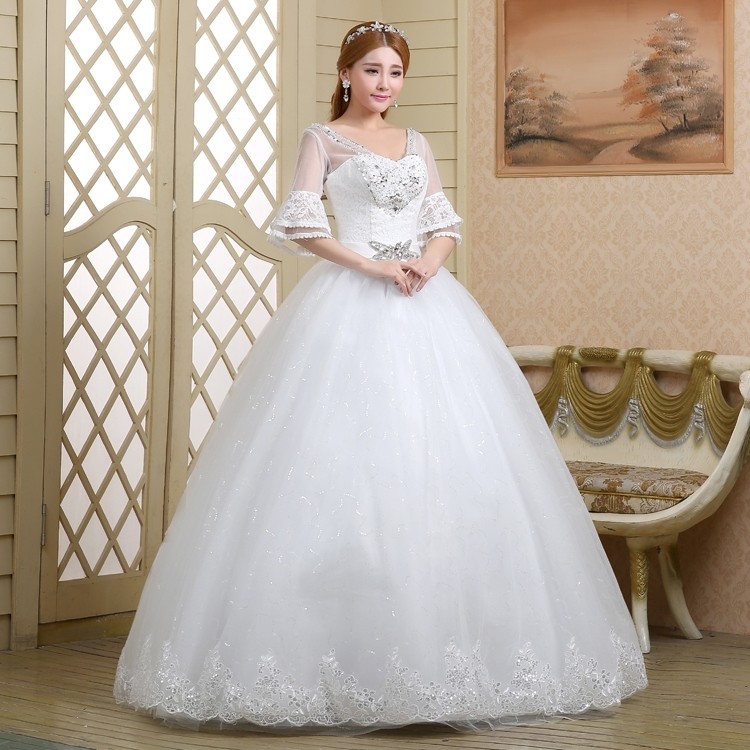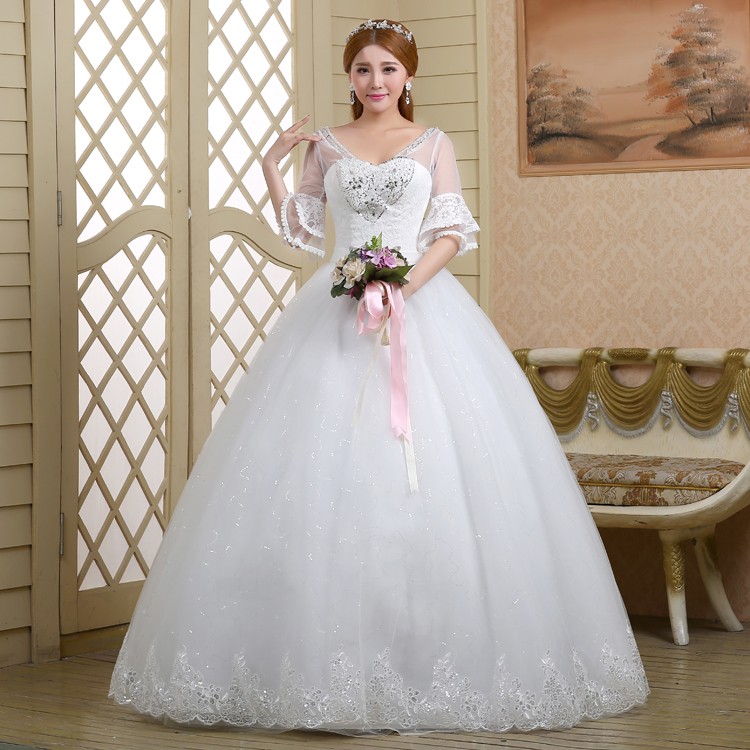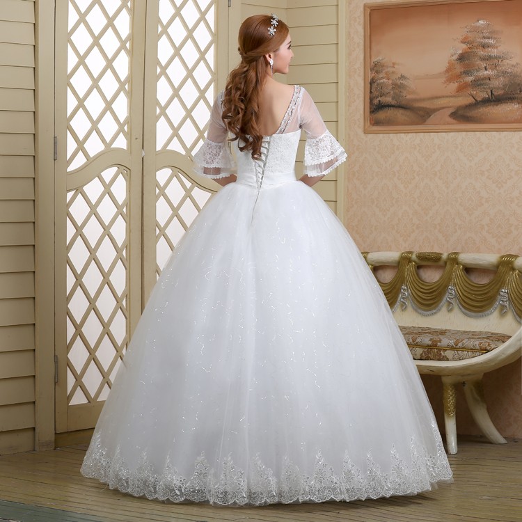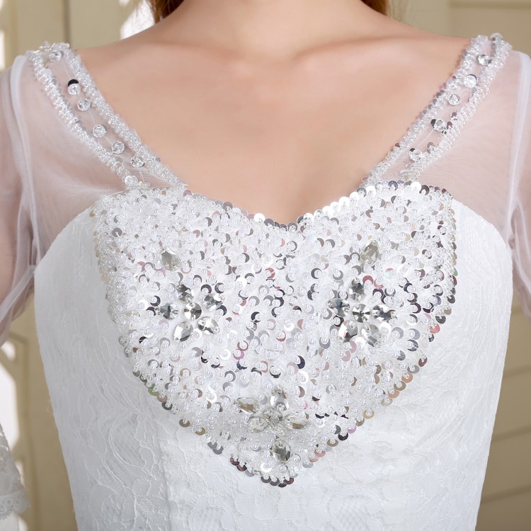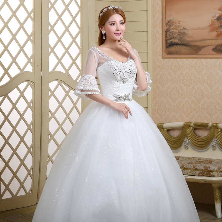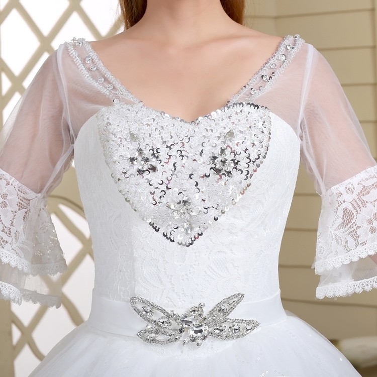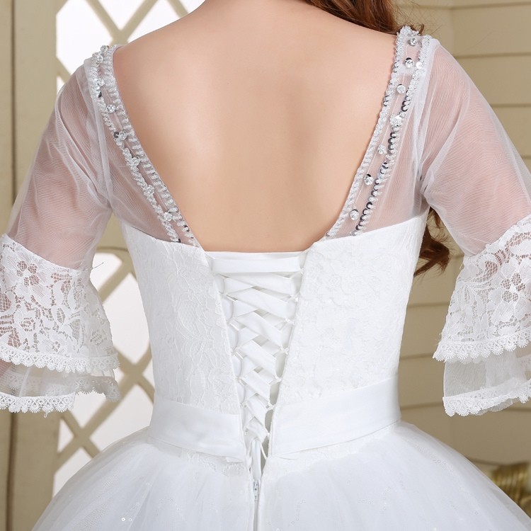 2017新款高档七分袖中袖婚纱 韩版大码蓬蓬裙蕾丝镶钻婚纱8056-1