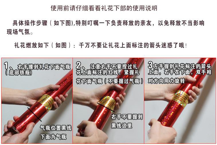 使用前务必掌握礼花的使用技巧,以免像有些亲们,拿回去之后一个都不会放,然后跑来说礼花质量很差,究其原因才知道压根就没旋转开,更有甚者说都没找到导火线...无语....