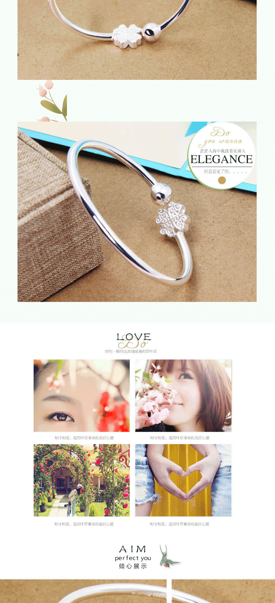 清新治愈系四叶草足银手镯 925纯银四叶草手镯