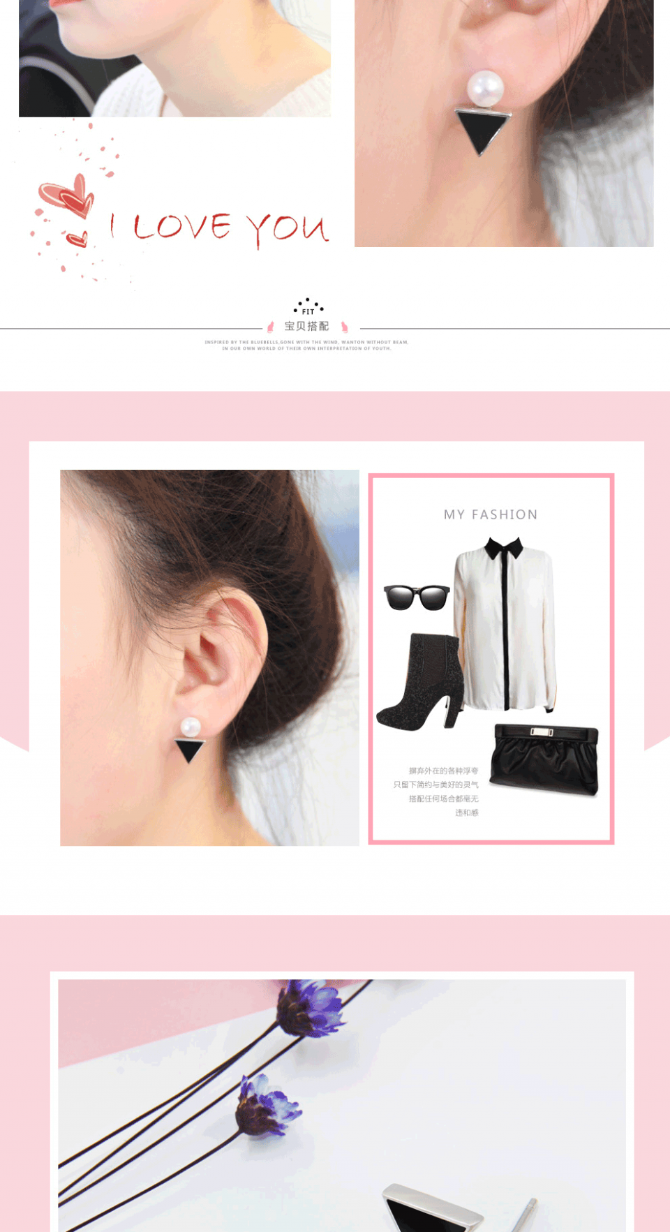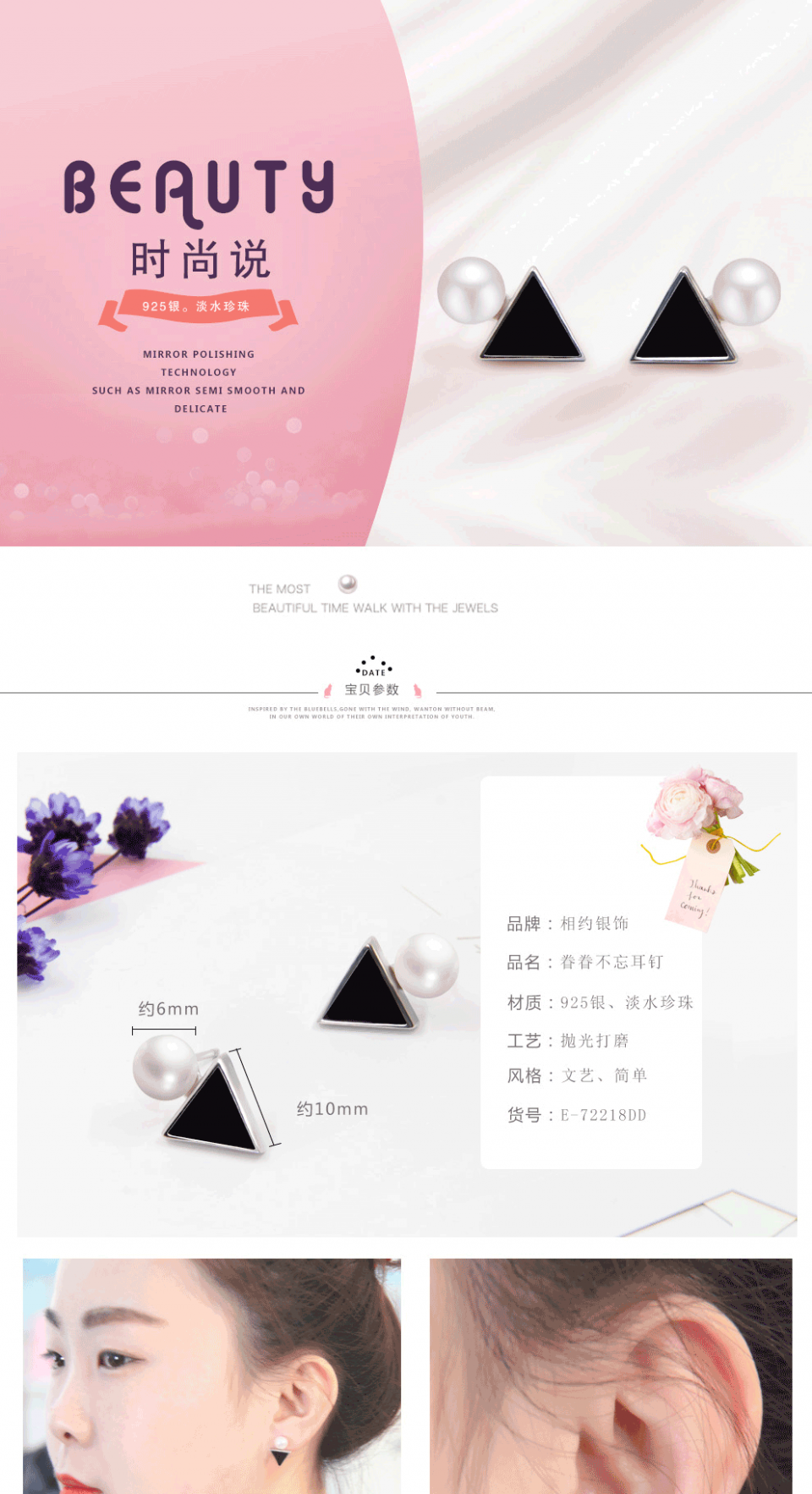 相约银饰 s925纯银天然淡水珍珠几何三角形复古简约耳钉耳饰