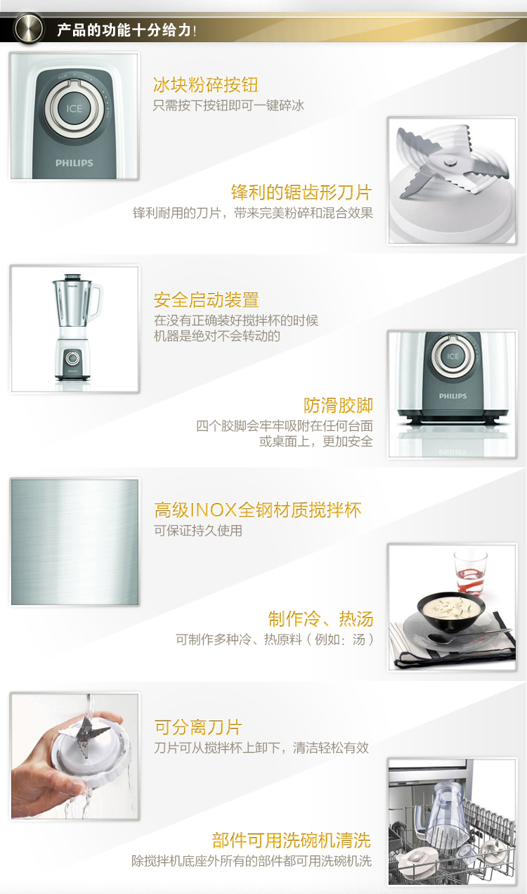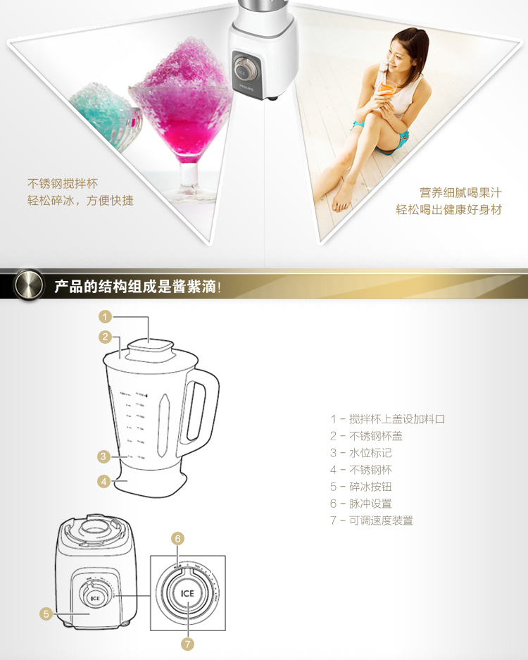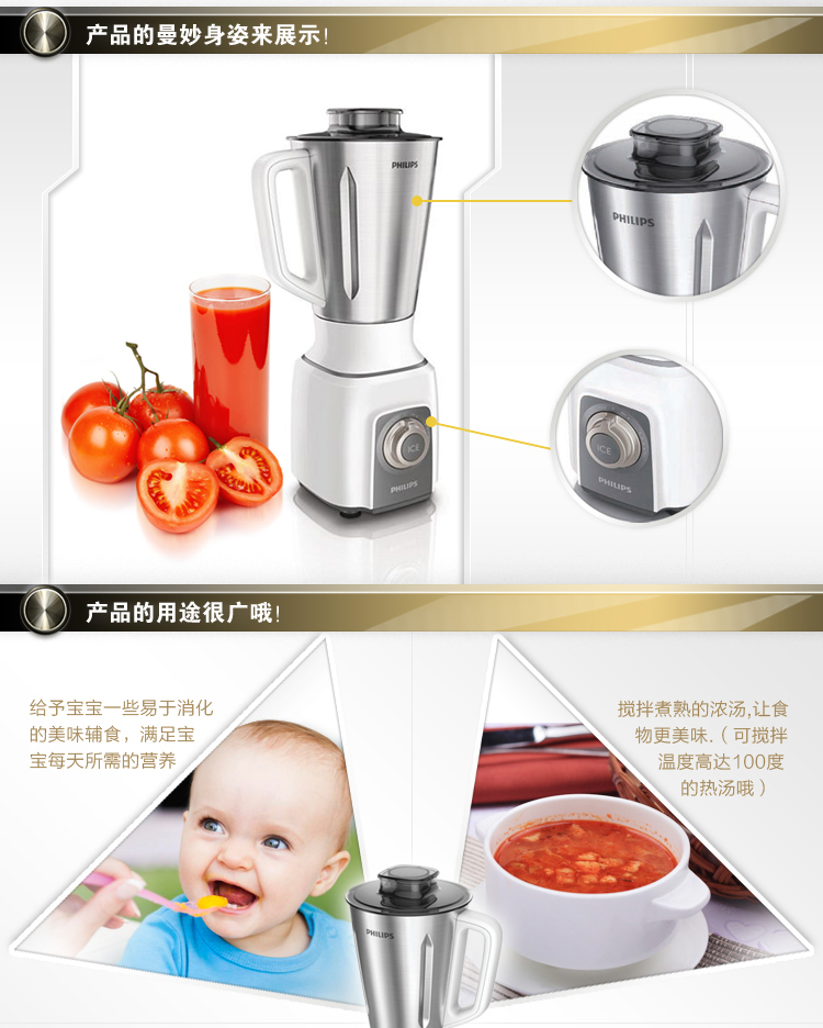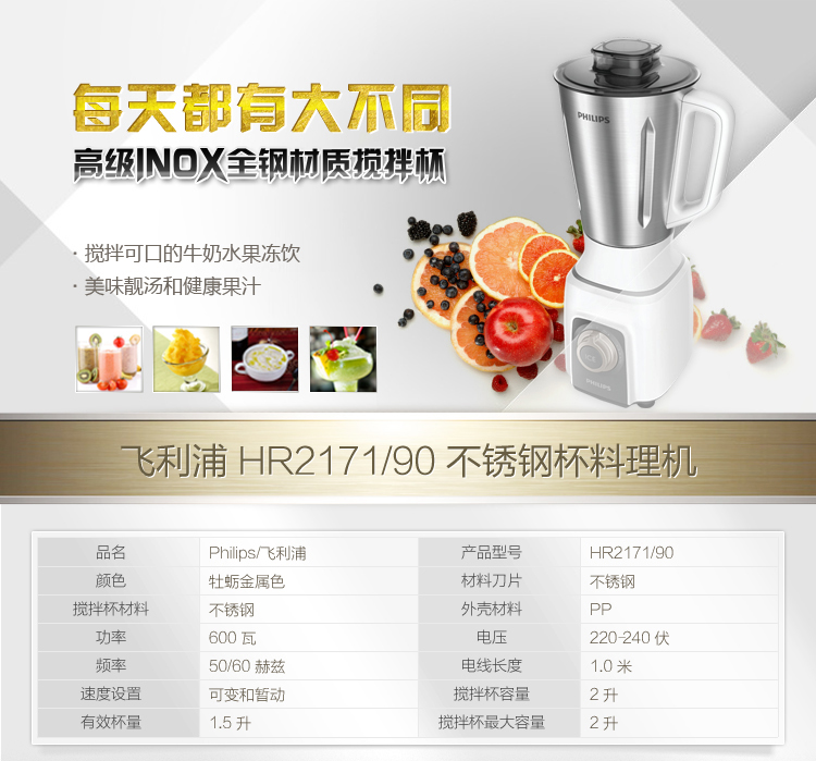 飞利浦(PHILIPS)搅拌机HR2171 家用多功能婴儿辅食料理机电动碎冰不锈钢搅拌杯