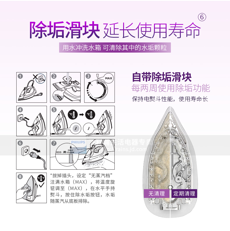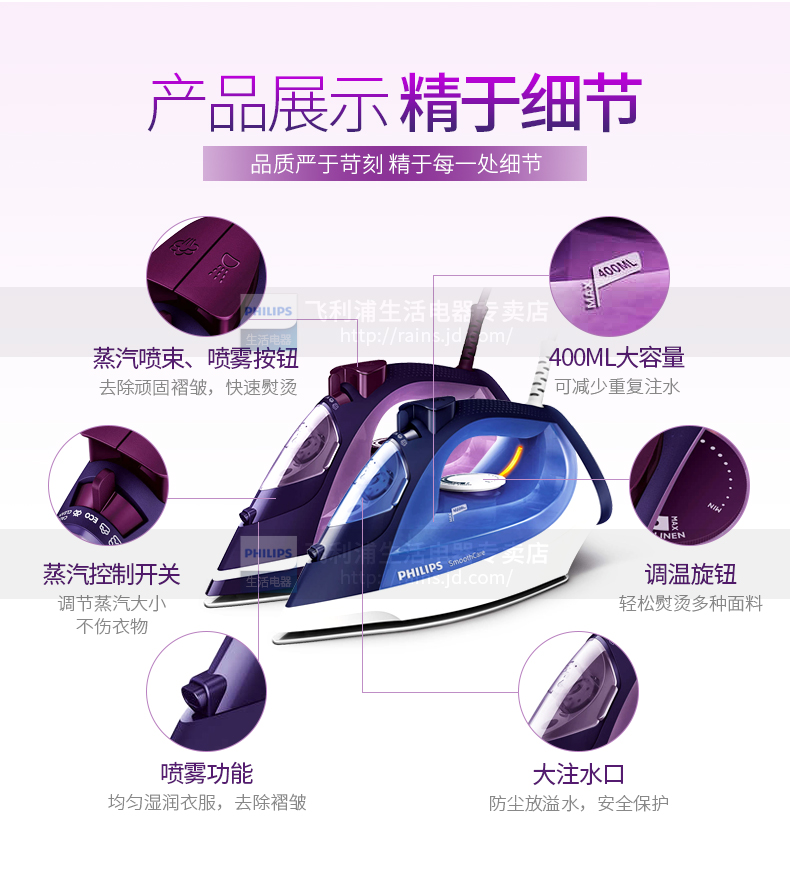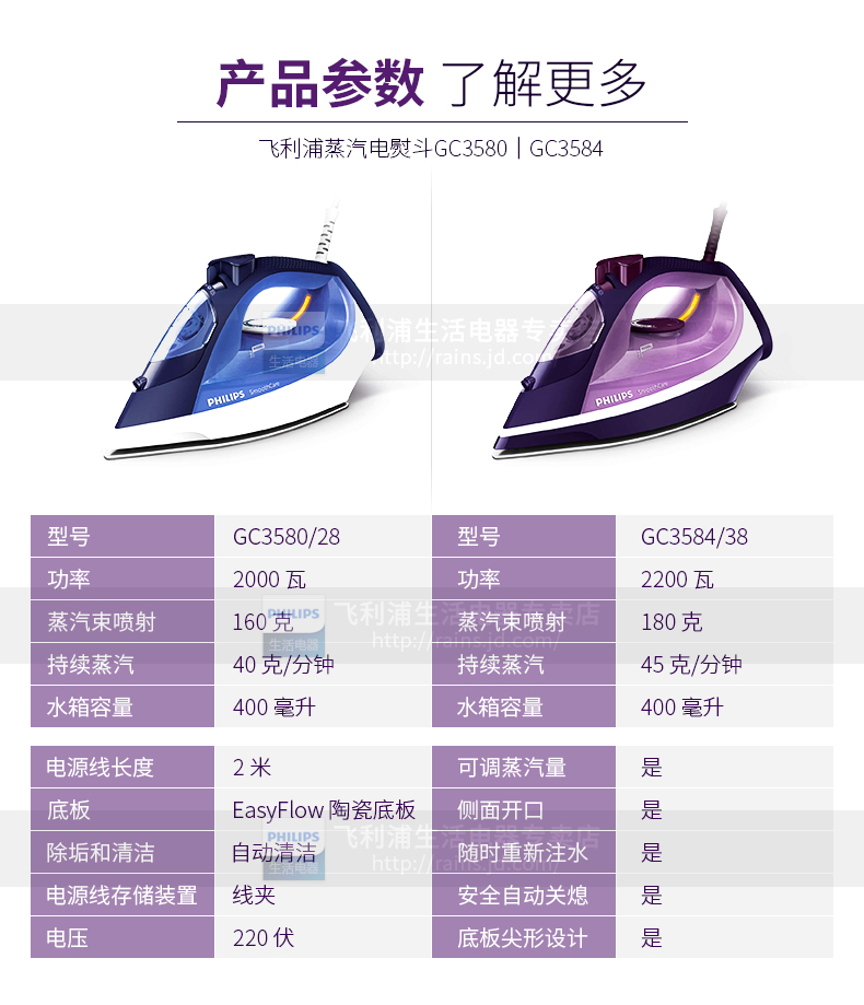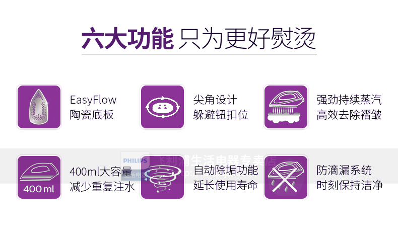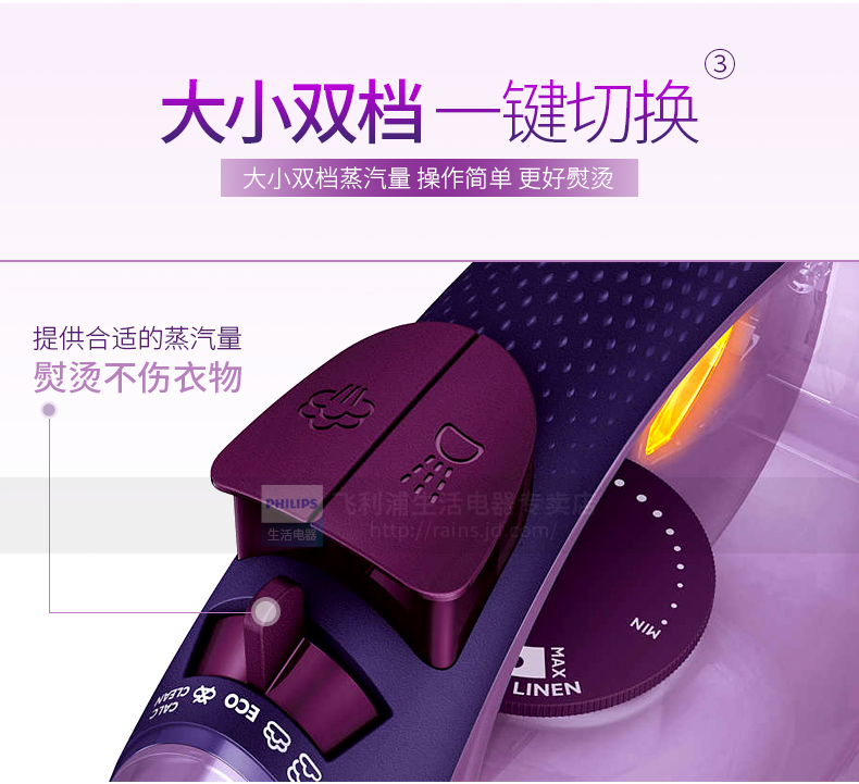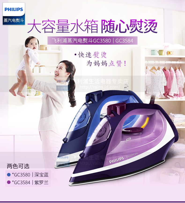 飞利浦(PHILIPS)蒸汽电熨斗家用手持迷你熨斗烫衣机2200W 紫罗兰GC3584/38