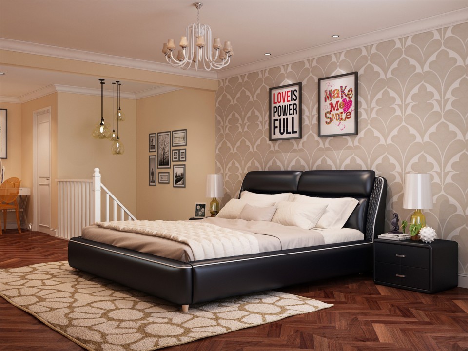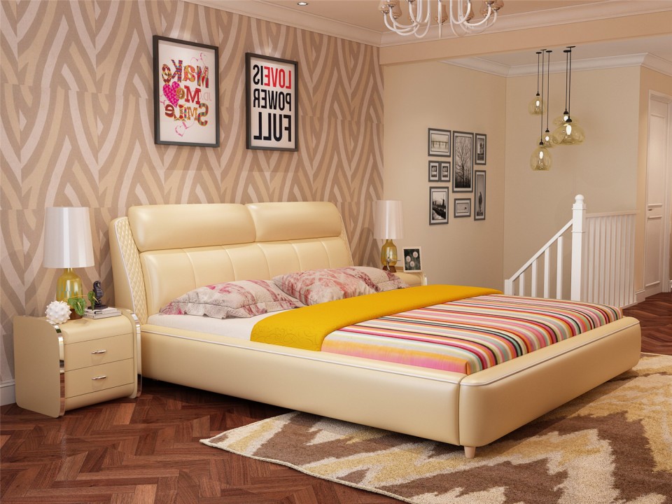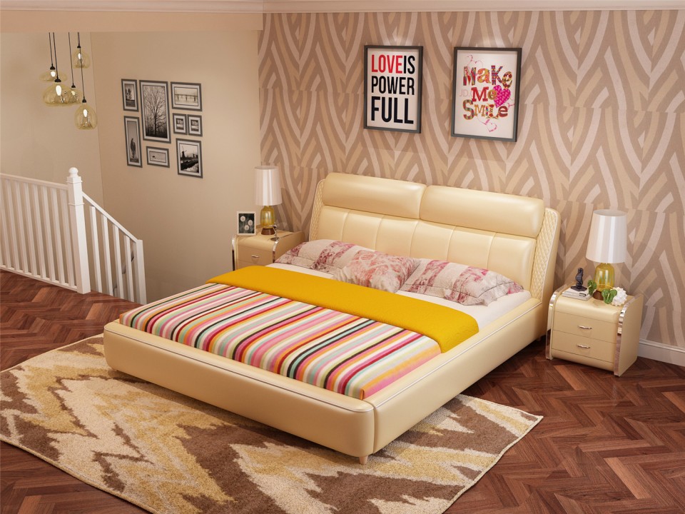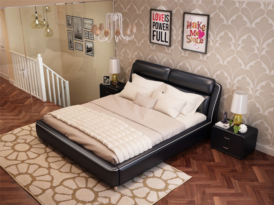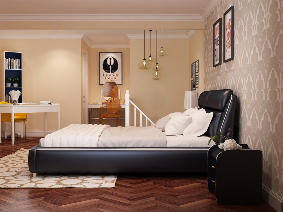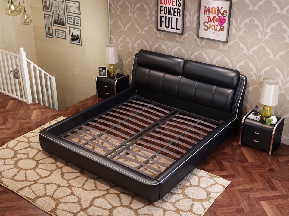 现代简约真皮软床1.5米1.8m双人床 小户型黑色黄色主卧室配套婚床