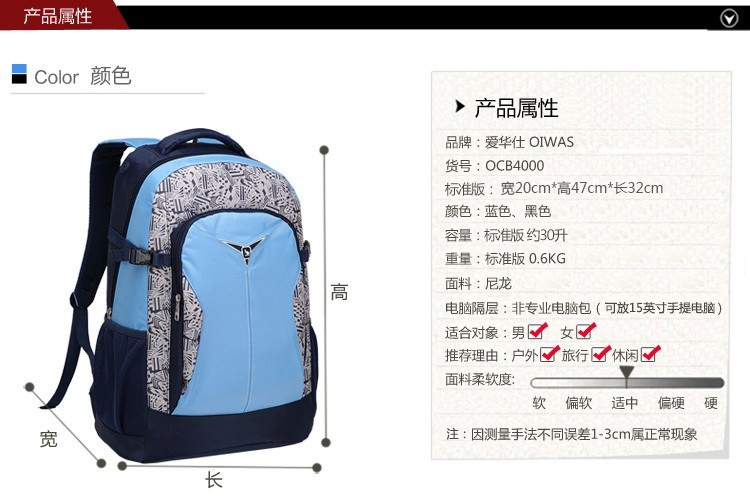 爱华仕(OIWAS)大容量双肩背包 笔记本电脑包15英寸 休闲户外男女学生书包 OCB4000M(标准版)