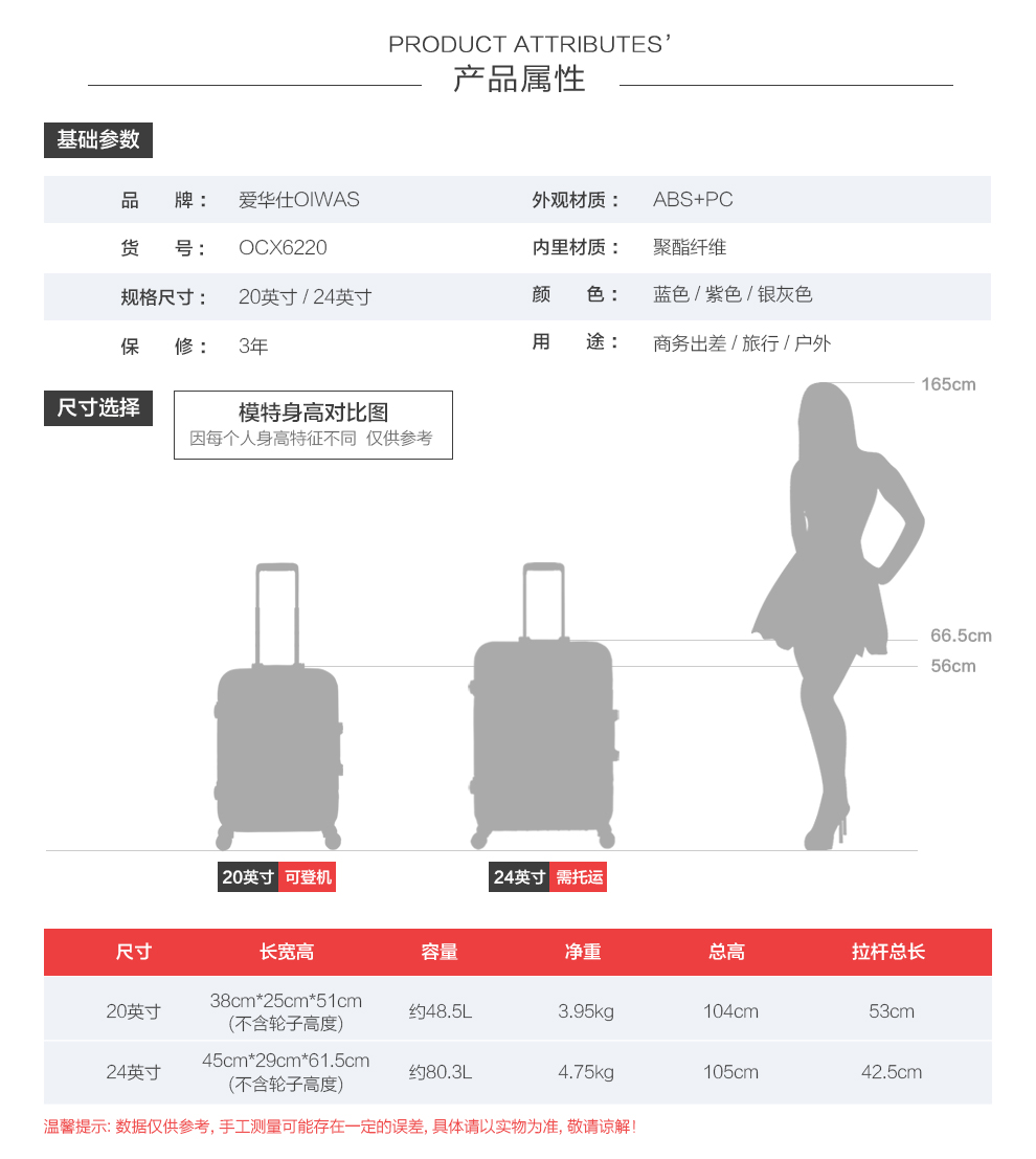 爱华仕(OIWAS)时尚铝框拉杆箱万向轮24英寸 拉杆登机箱20英寸旅行箱男商务 OCX6220